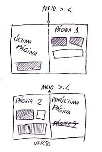 A segunda folha terá num dos lados a última página do zine do lado esquerdo (a não ser que o sentido de leitura não seja o ocidental) e do lado direito a página 1. No verso da folha, coloque a página 2 do lado esquerdo e penúltima página do lado direito. Desta forma, ao juntar as folhas e dobrá-las, você permite que a leitura corra como numa revista, como no exemplo abaixo: